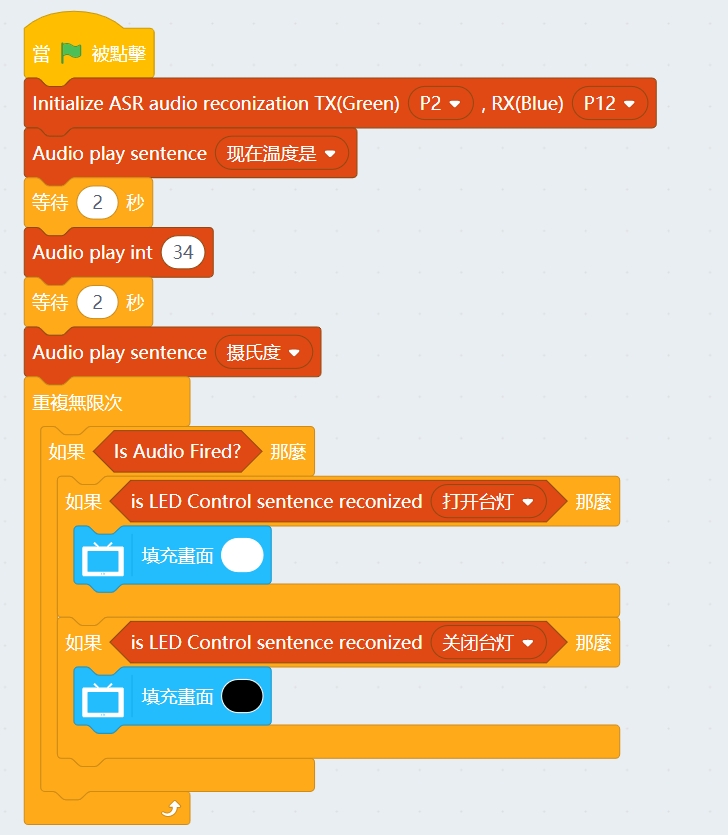 注意:2個語音播報指令之間需要加等待,等待上一個語音播報完成,否則語音播報會重疊。