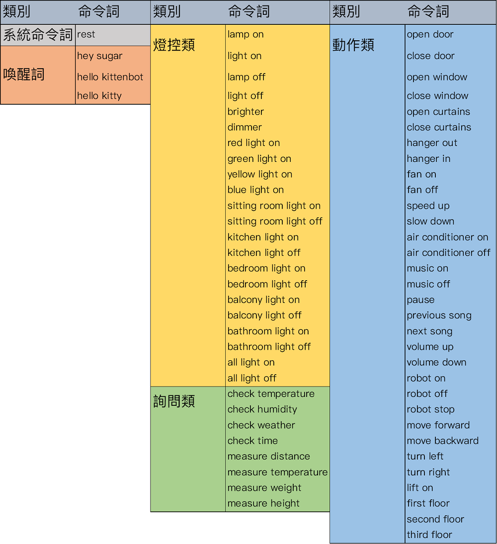 <figure><img src="https://879637118-files.gitbook.io/~/files/v0/b/gitbook-x-prod.appspot.com/o/spaces%2F6uJvpXC43onNIIwhMlWo%2Fuploads%2Fcx0xeDh3axNolEMG0cCo%2Fasr_commands_chinese.png?alt=media&#x26;token=c4900b0f-a163-4d36-a38c-80f4e53ca31b" alt=""><figcaption></figcaption></figure>