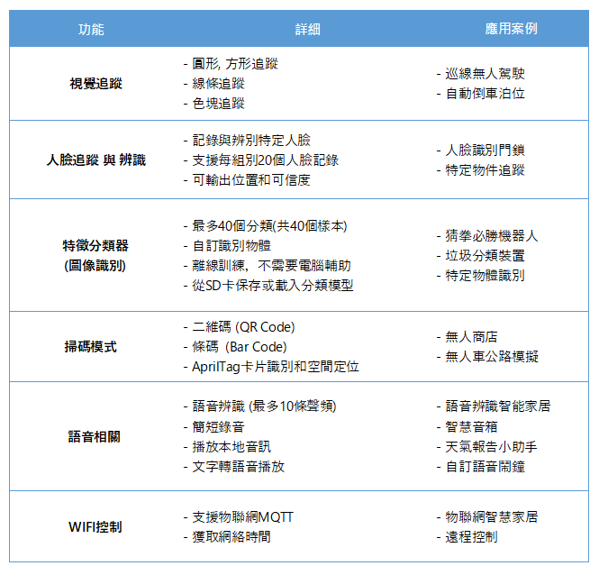 · 可自主訓練機器模型,並支援由記憶體卡從外部導入模型使用