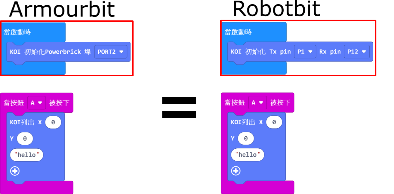 在後面教學中的編程我們會用Robotbit為例子,假如你用Armourbit,只要使用相應的初始化積木即可。¶