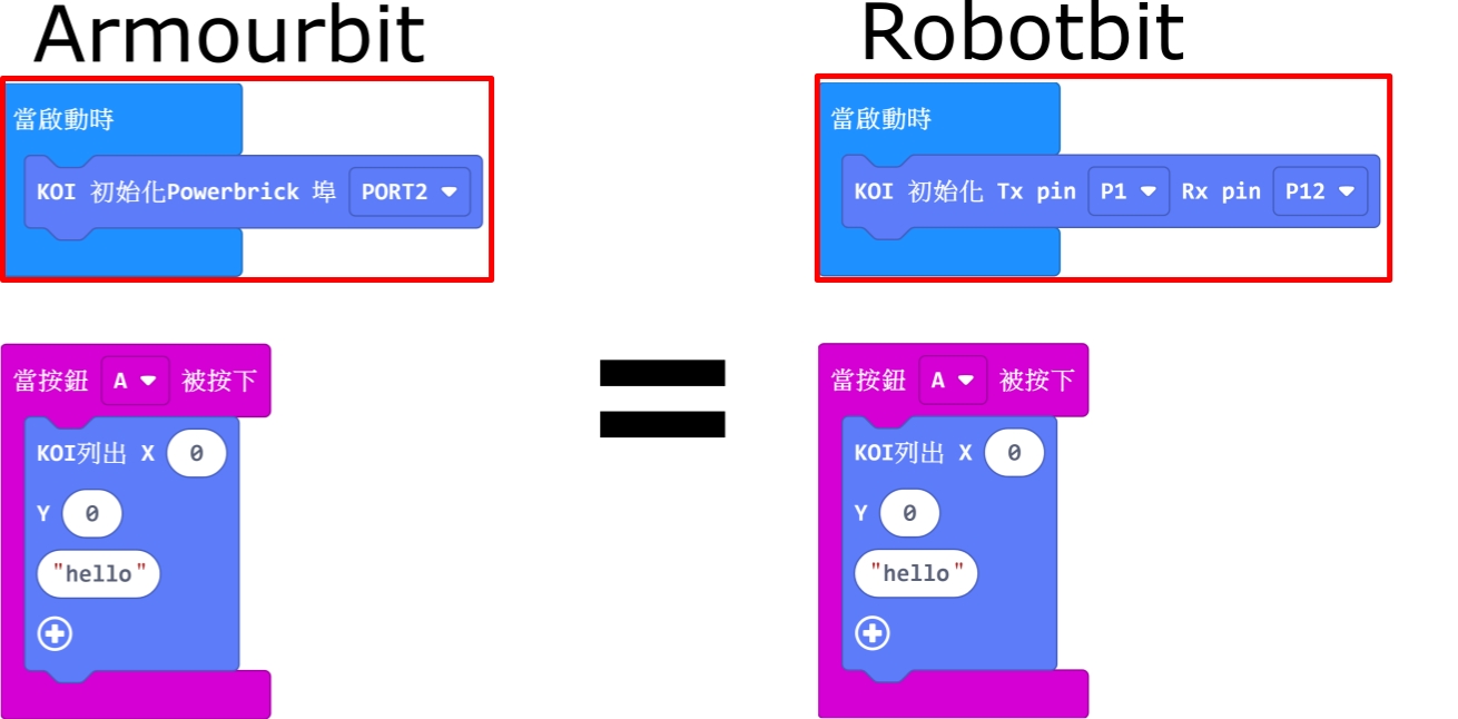KOI支援Robotbit與Armourbit,兩者分別只是在於初始化積木的分別。
