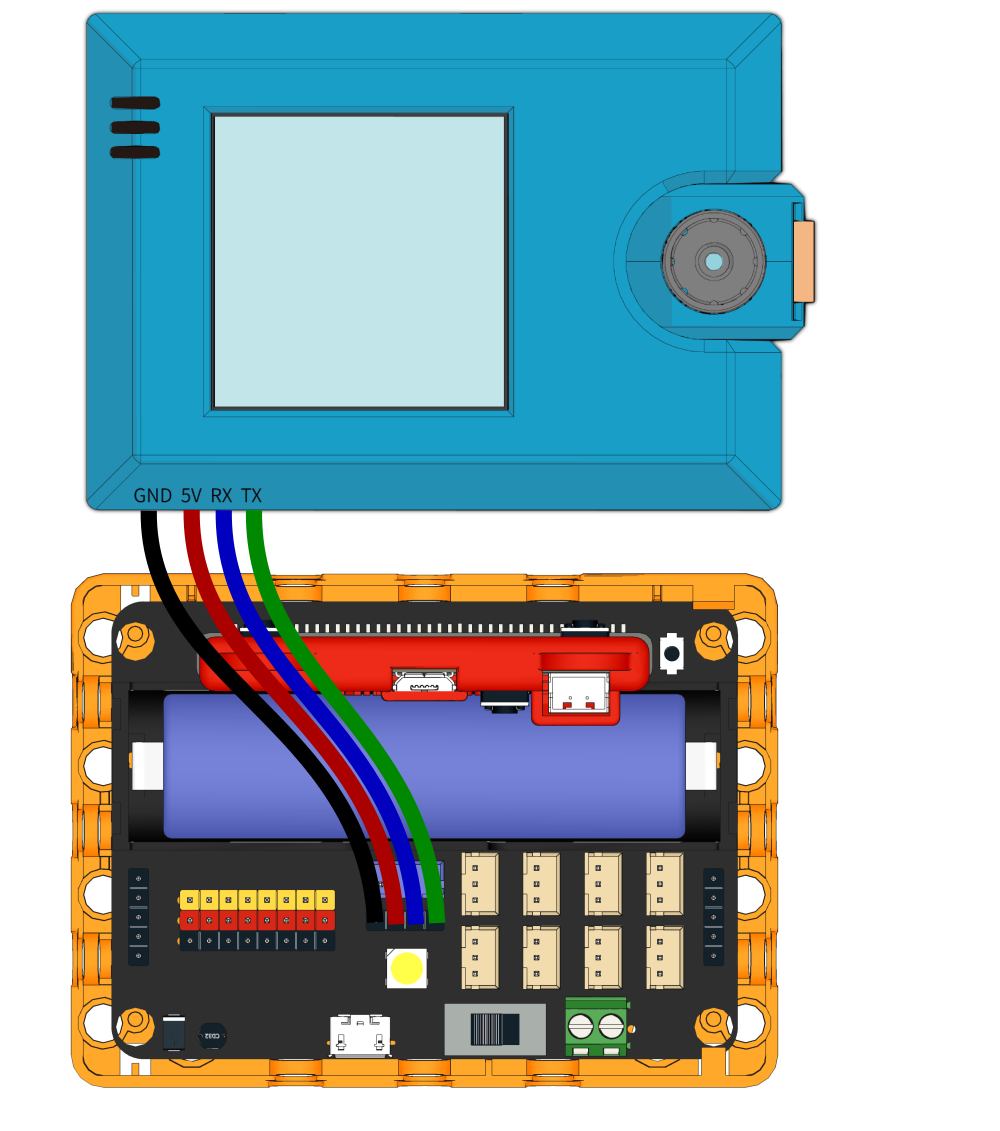分別對應Robotbit 上 - GND, 5V, P1(TX), P12(RX)