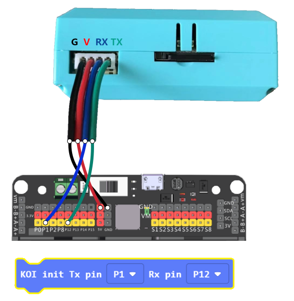Robotbit Edu上已經提供了4pin的通訊接口,我們只需要將KOI連接到通訊接口就可以了。