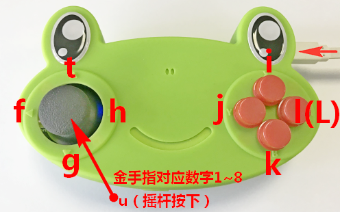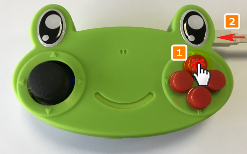 按著X鍵不放手,用USB線連接到電腦。JoyFrog會發出兩下較長的聲音,代表成功進入2號玩家模式。