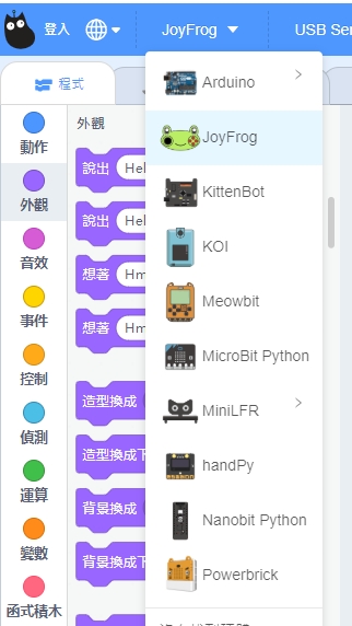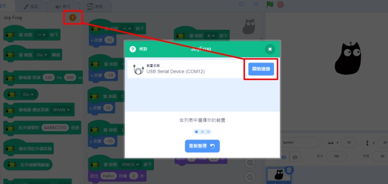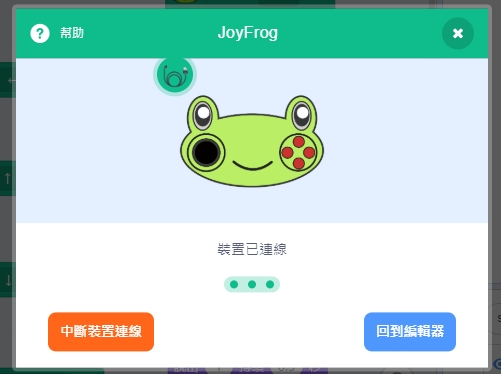 在JoyFrog的積木欄中按下感嘆號 ( ! ) 按鈕。然後點選『開始連線』。