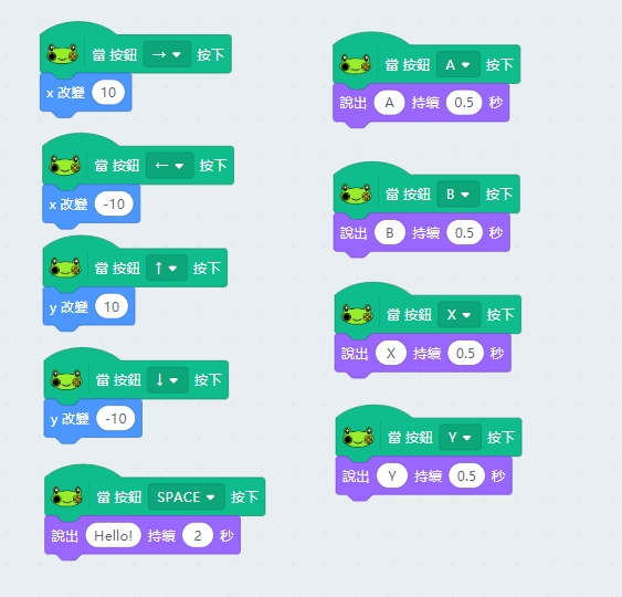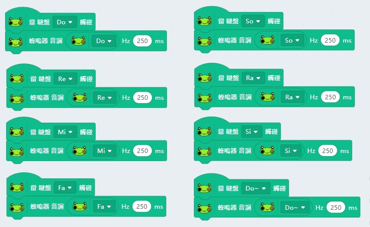 鍵盤(Do-Do~)觸碰的積木與按鈕(1-8)按下的積木是一樣的,只是為了方便大家對音調編程,特意用這個積木。