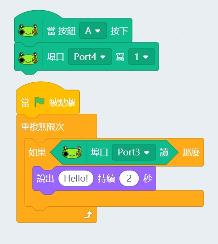 按下A鍵寫入數位數值。讀取到數位模組(例如按鍵)數字的時候小貓會說Hello。