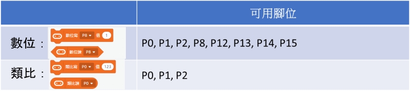 Pin 0-2可以用作類比引腳,其他Pin只可以用作數位引腳。