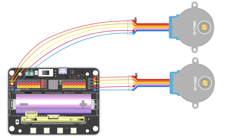 將步進電機連接到Robotbit的M1和M2上(將紅色電線連接到VM)。
