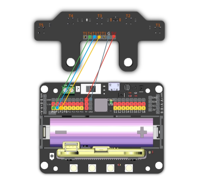 這是一隻巡線傳感器,它有五顆巡線感應器,它返回的數值是類比形式。感應器收到的光度越少(遇上黑線),返回的數值就會越低。