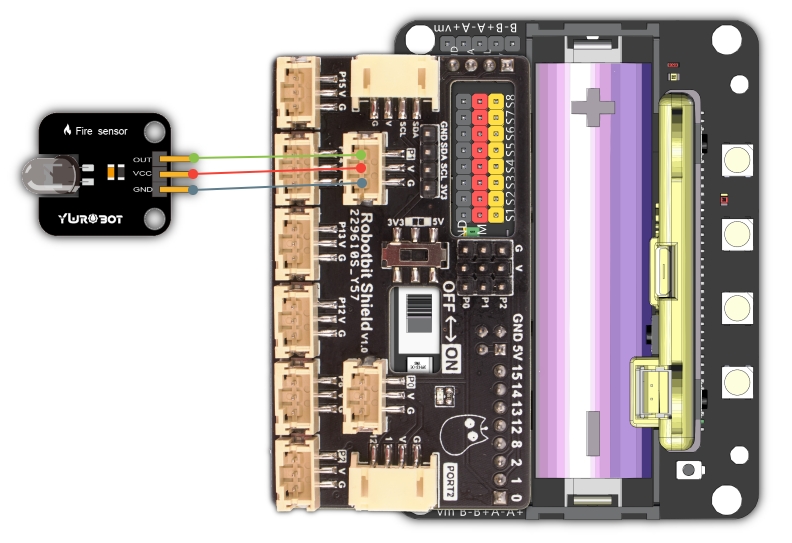 將火焰感應器模組連接到Robotbit的針線和3V接口。