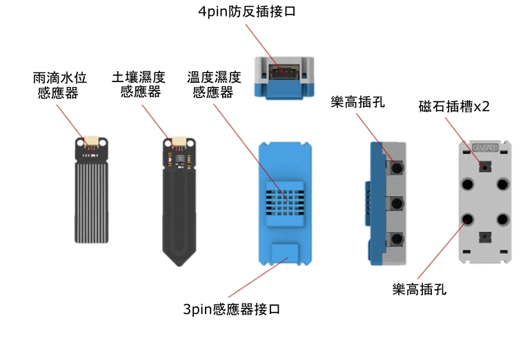 此模塊用於探測環境的溫度和濕度。附有3pin防反插接口,可以加插雨滴或土壤魔塊。
