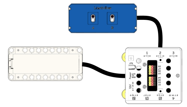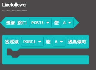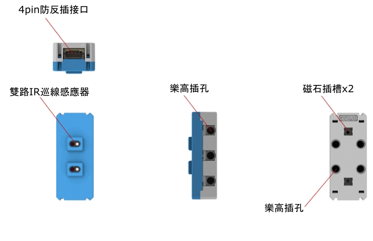 這是一個紅外線巡線魔塊,它有組兩路尋線感應器,偵察到黑線後魔塊背面的LED會熄滅,觸發尋線事件。