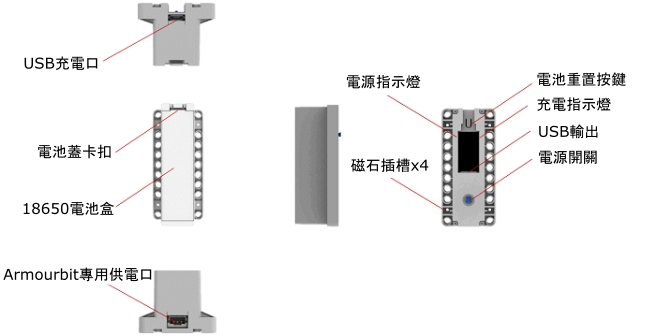 這是PowerBrick的電源魔塊,用於Armourbit的供電,為Microbit與電機、舵機和各種魔塊進行供電电。使用3pin防反插排線連接,附帶Micro USB充電口,帶短路過流保護電路。另外也可透過USB提供5V電源,為其他主板(例如robotbit,AI鏡頭KOI)。需要使用18650鋰電池。