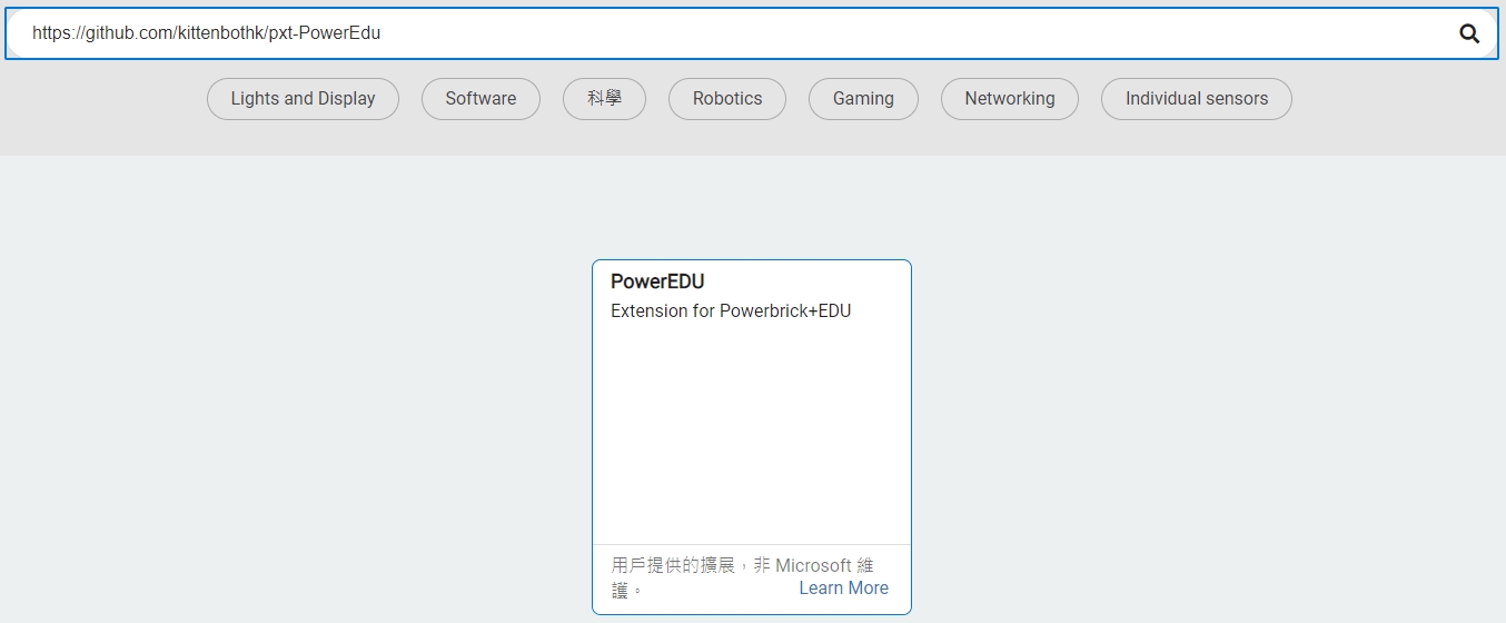 在搜尋欄中填入”https://github.com/kittenbothk/pxt-PowerEdu” ,然後按Enter。