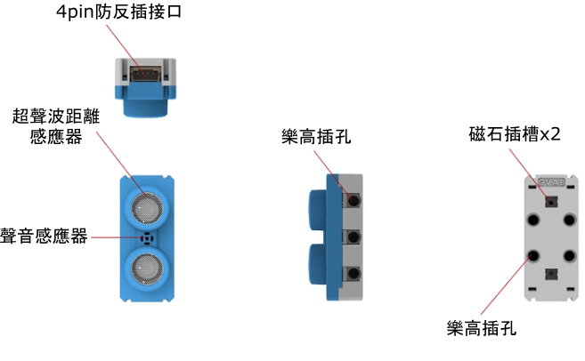 這魔塊包含了超聲波感應器和咪高峰。它可以用超聲波來測量與物件的距離,咪高峰可以探測環境聲音的強弱。