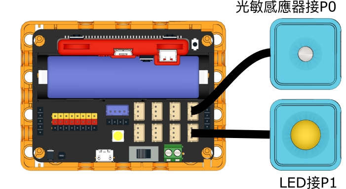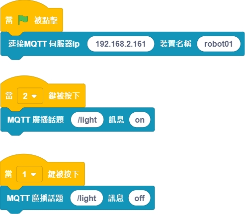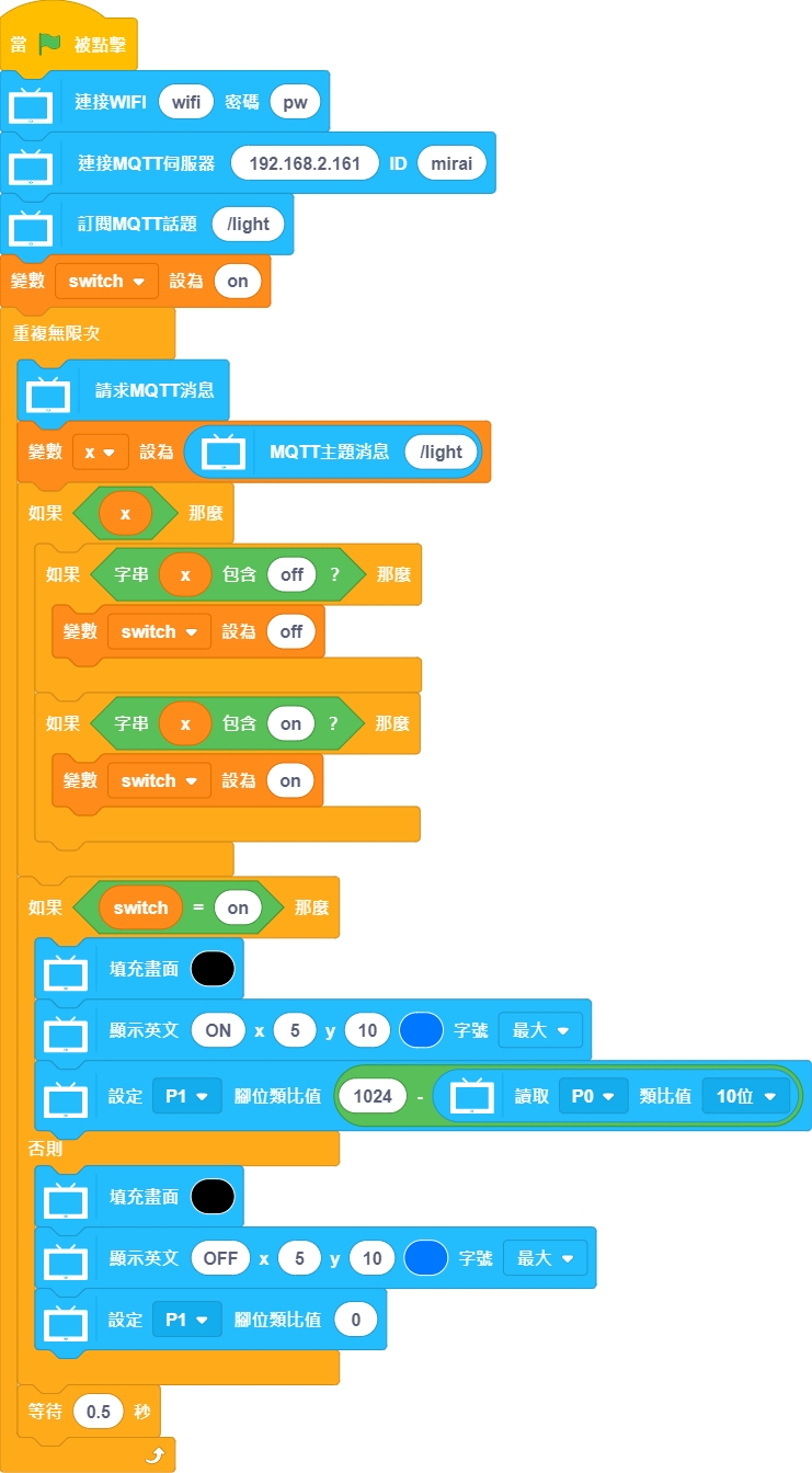 使用Kittenblock控制端程式控制路燈的開或關,按1關閉,按2開啟。開啟後路燈的亮度會因環境亮度作自我調節。