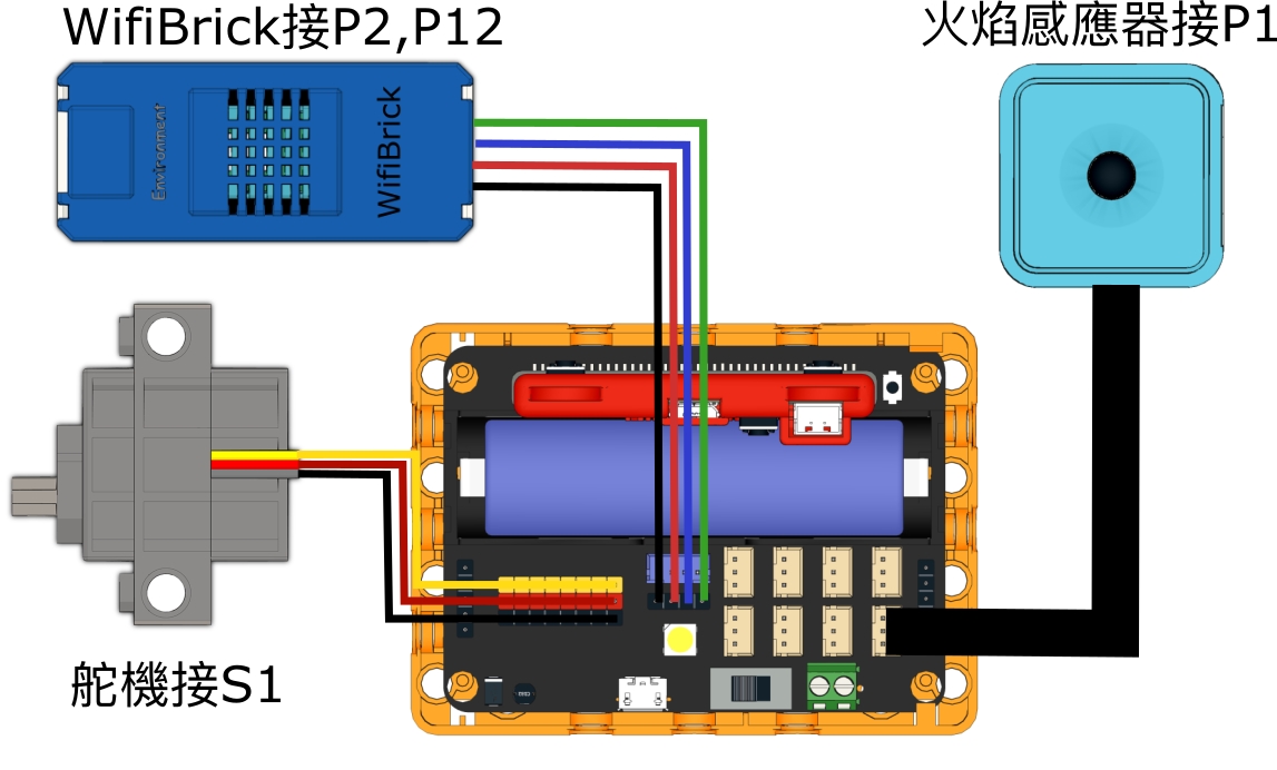 探測器會左右擺動,當感應器探測到火焰時(可以電筒模擬),就會響起警報並且在物聯網平台警告用家。