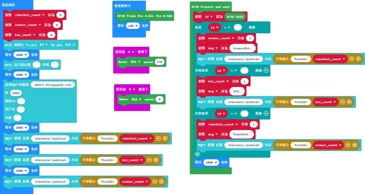 當RFID魔塊感應到貨物的RFID晶片後,Micro:bit會顯示RFID資訊,並且會將貨物資料上傳到ThingSpeak平台