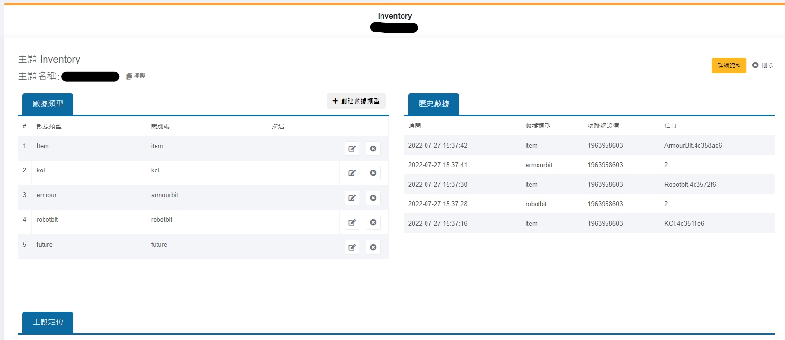 在MakeCloud平台建立新主題,建立數據類型item、koi、robotbit、armourbit。(貨品參考)