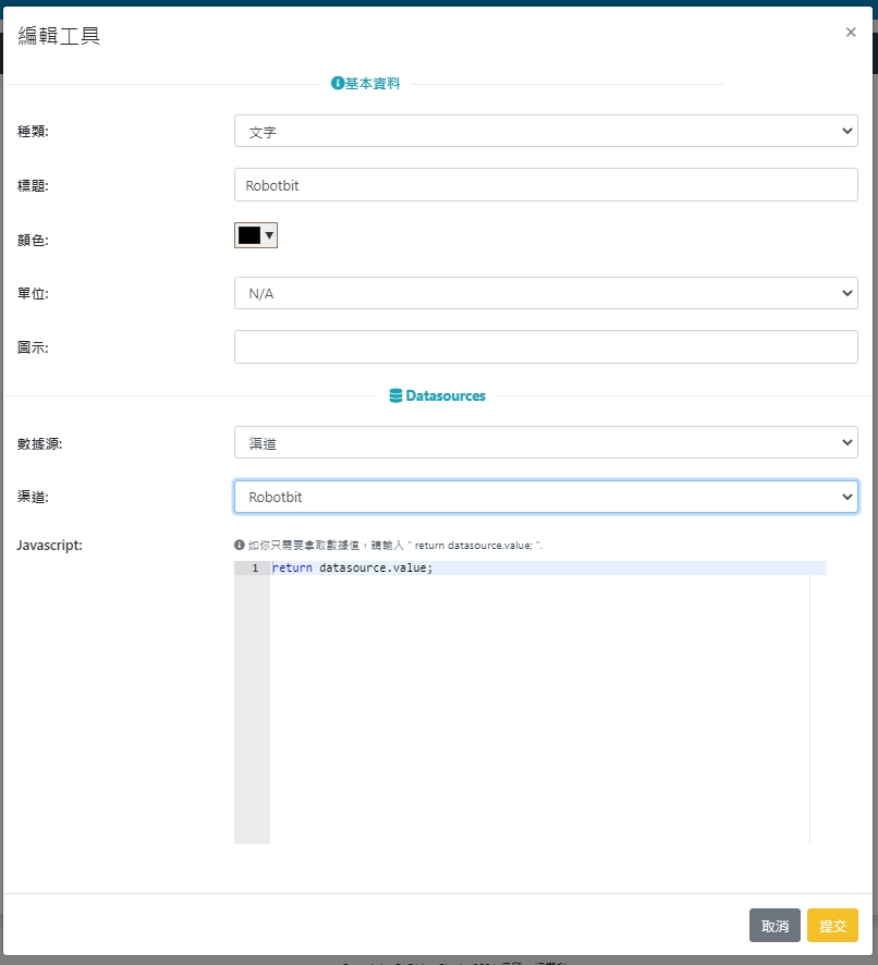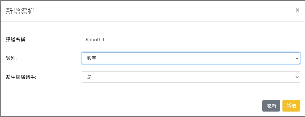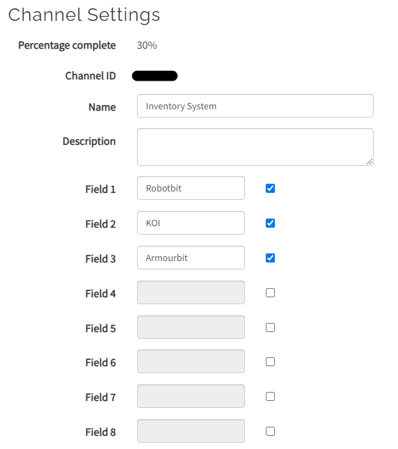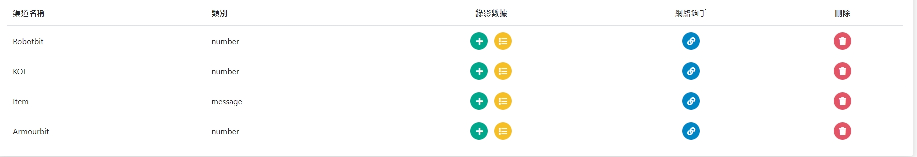 建立ThingSpeak頻道,設定數據欄Robotbit,KOI,Armourbit,Item。