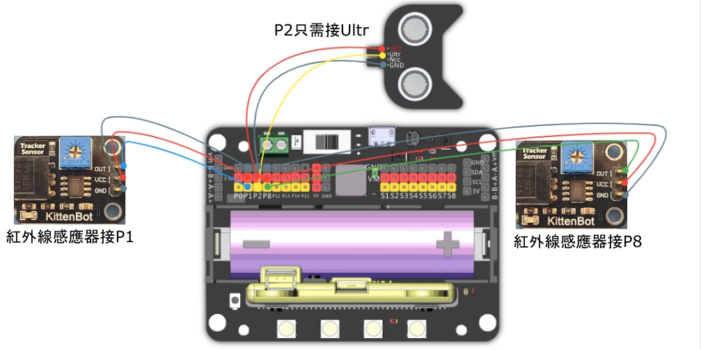 巡線感應器的檢測距離可以調較,靈敏度設定位於感應器上的藍色旋鈕,請使用螺絲批調節檢測距離(向左調高,向右調低)。