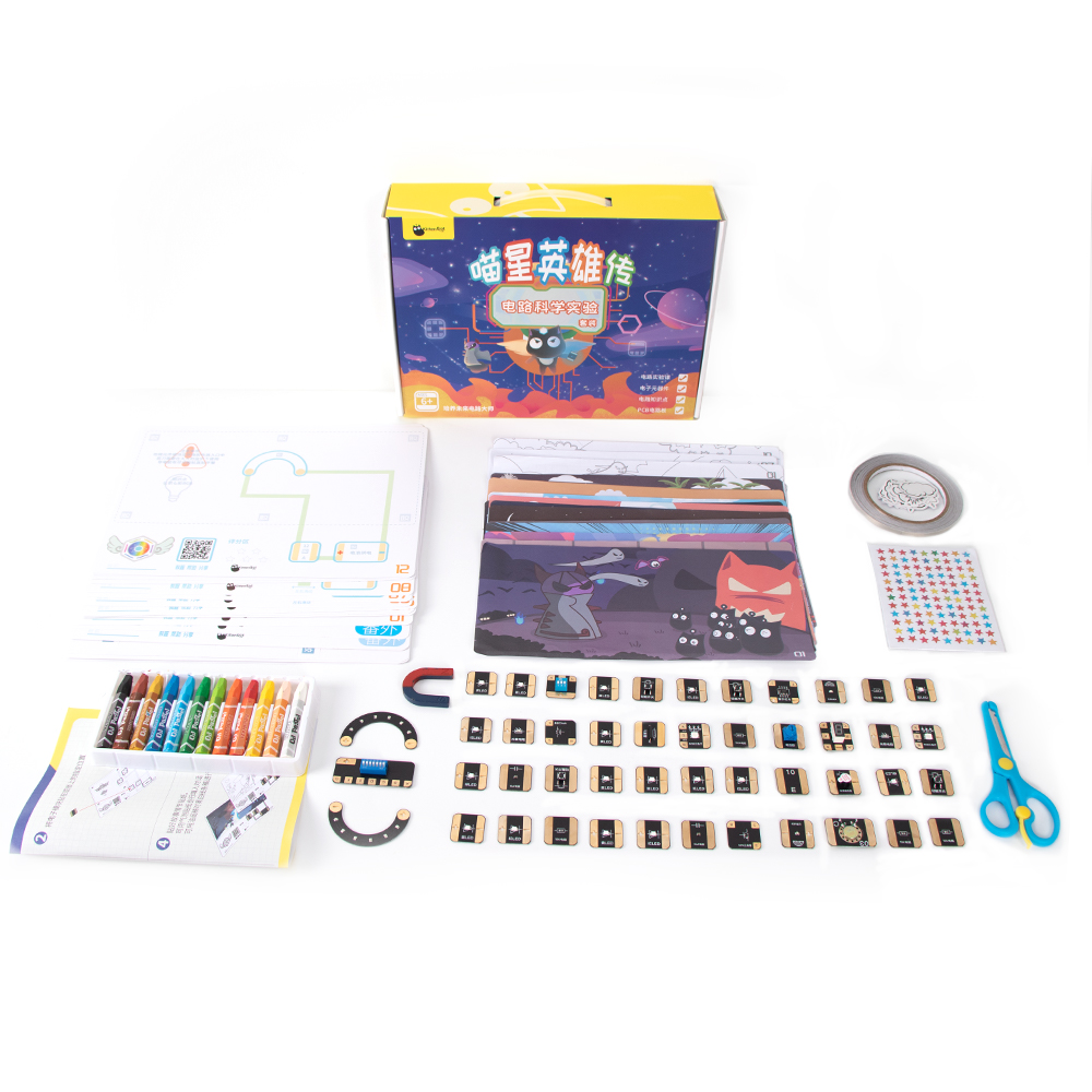 套件裏包含12個故事情境,配合導電膠布與總共47塊的電子元件,以生動有趣的故事形式令學生能夠輕鬆愉快地學習電路的知識、光與聲的原理還有如何搭建電路,為STEM教育打好基礎。