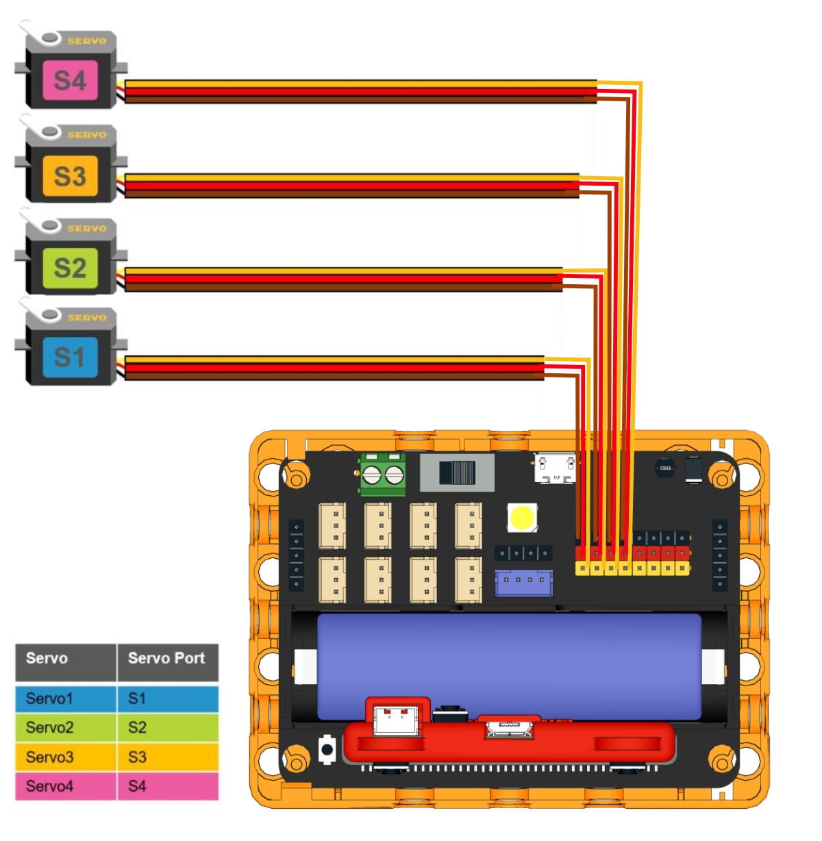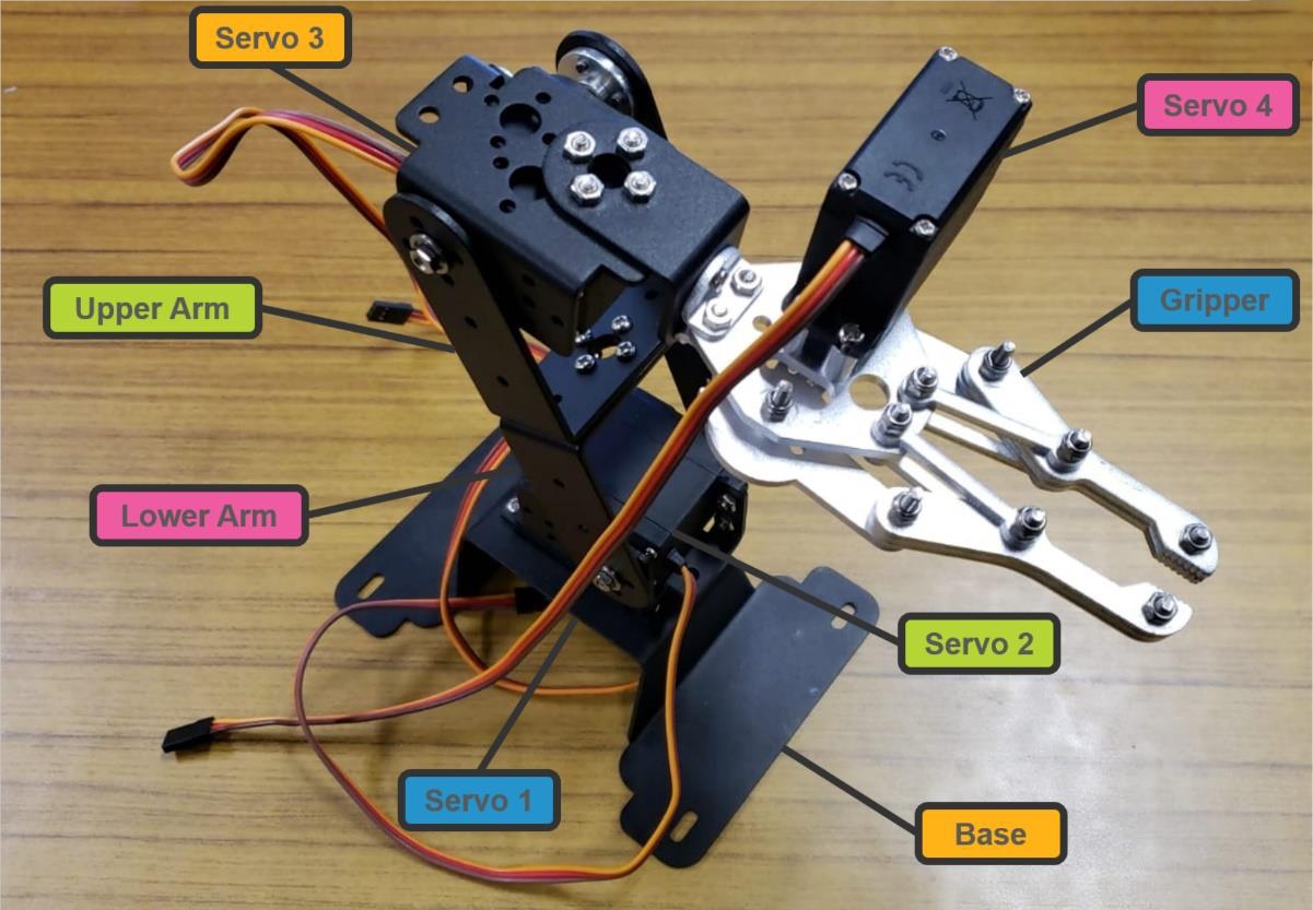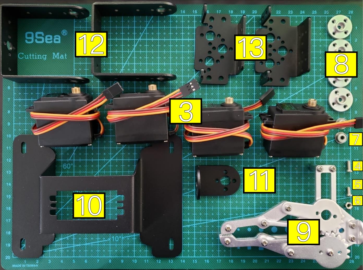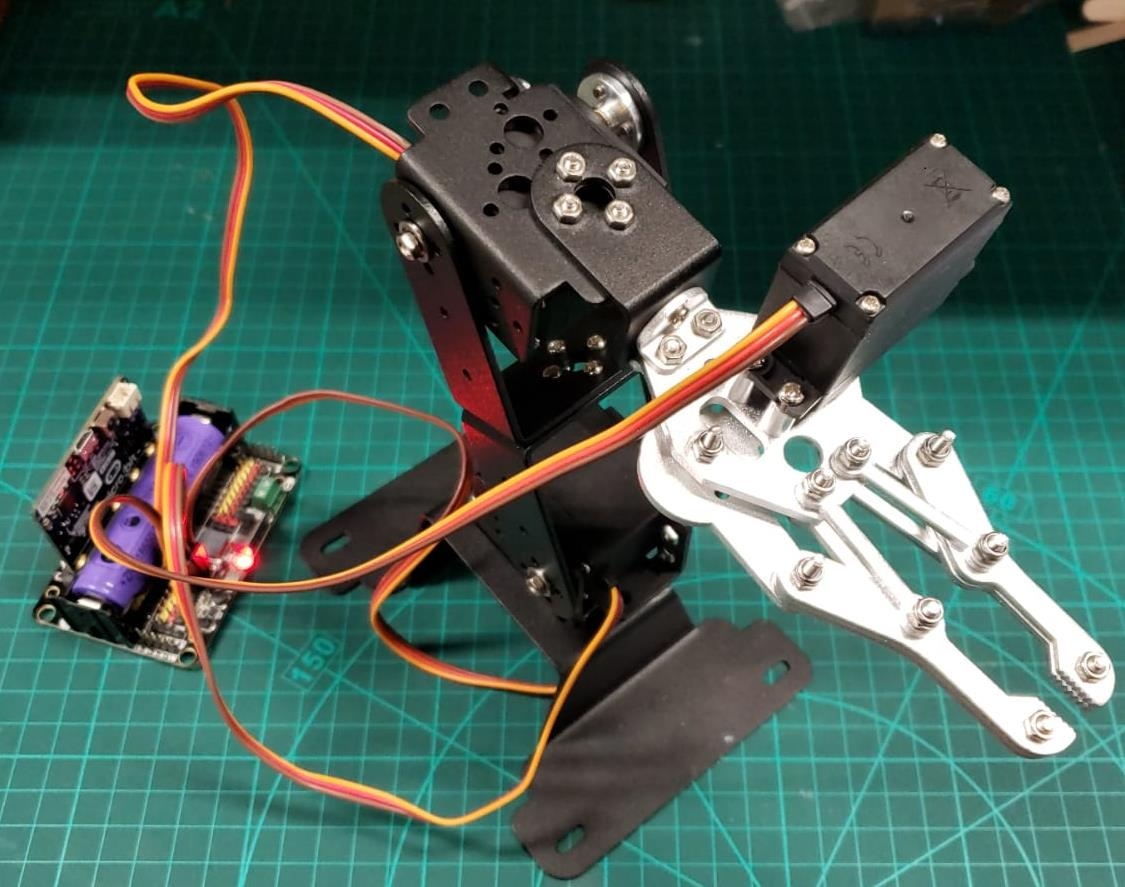 Robotbit機械臂是一套機械套件,套件可以搭建出一隻以4隻大扭力金屬齒輪舵機驅動的活動機械臂。