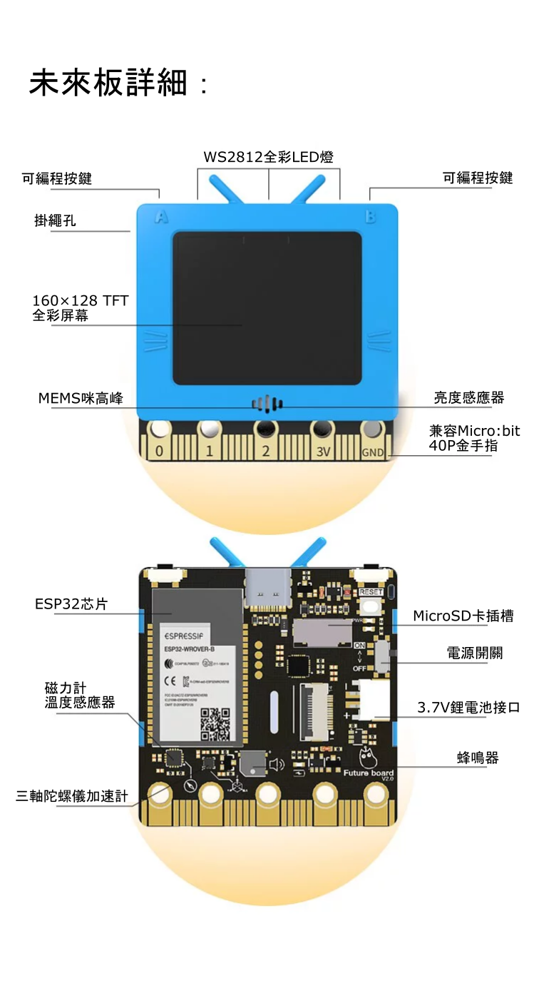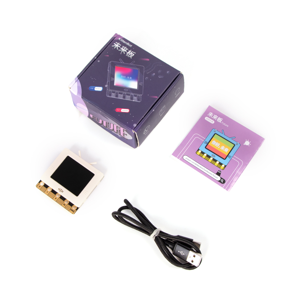 未來板顧名思義,是一塊為了未來的編程教育而打造的主控板。它上面不但搭載了多款實用的感應器,更加有一塊全彩的TFT屏幕,資訊可以實時顯示在屏幕上,方便大家製作更多有趣的編程作品。