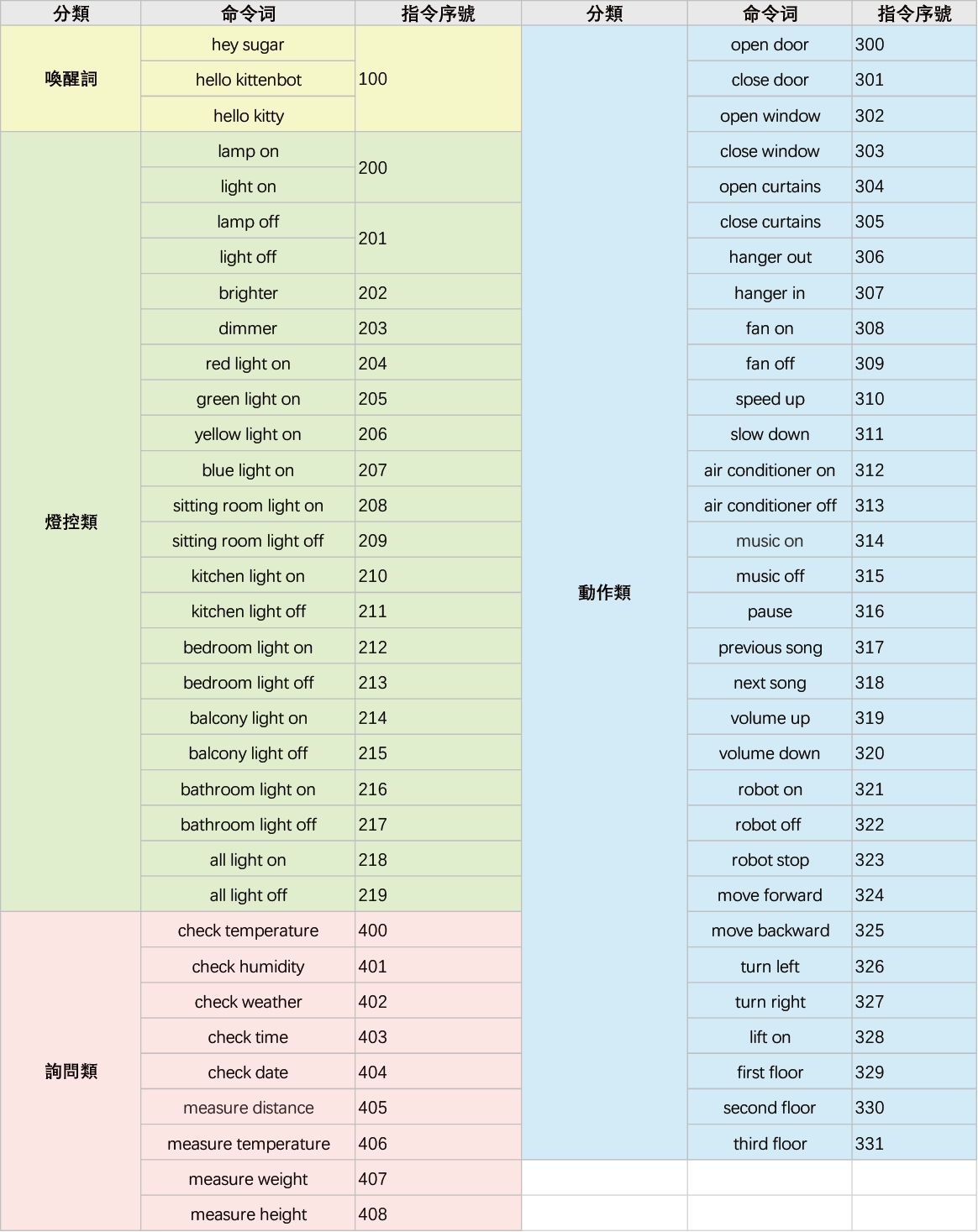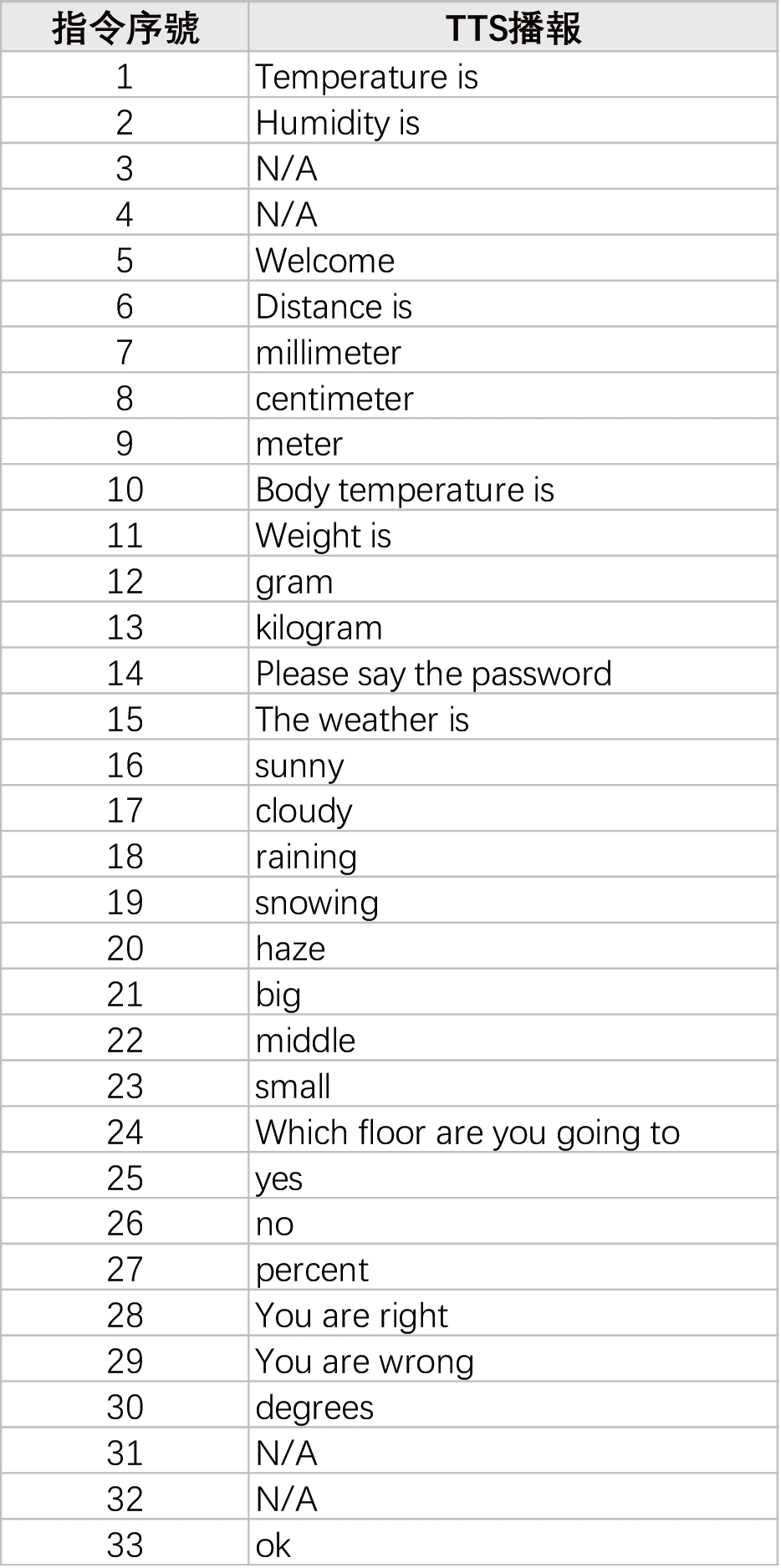 返回語音模組所聽到的指令序號,詳細序號請參考以下列表。