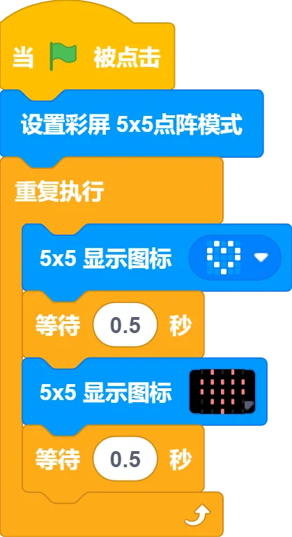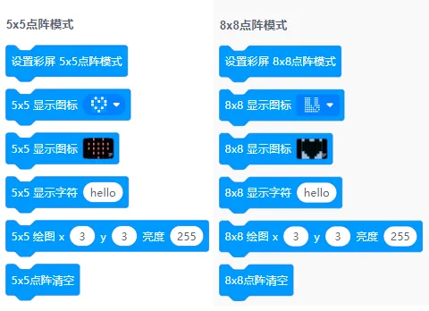 沿用microbit的5x5 led點陣，並且擴展了8x8模式。在學習全彩屏幕模式之前，也可以先通過點陣模式精簡的像素量。座位過度。
