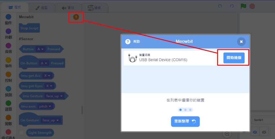 要在Kittenblock對Meowbit編程,我們首先要與Meowbit建立連接。