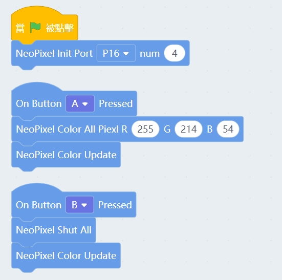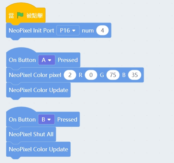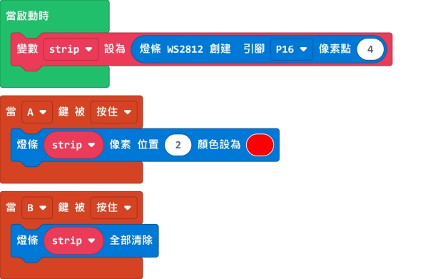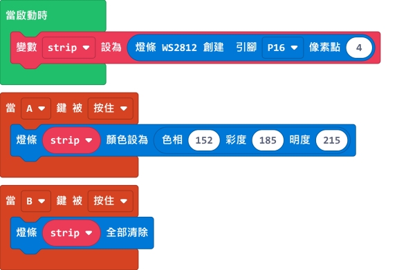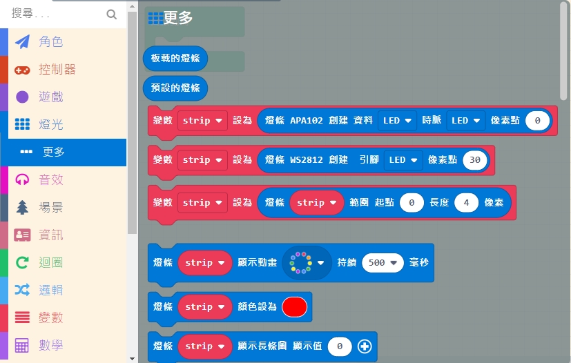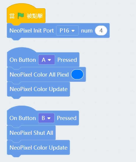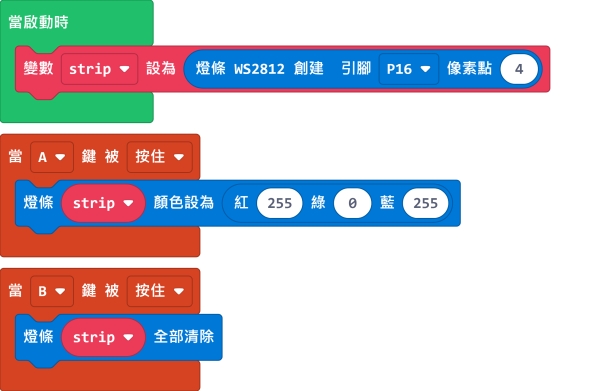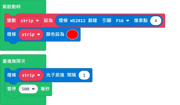 使用Meowbit亦可對Neopixel的燈條編程,例如Robotbit上的燈條。