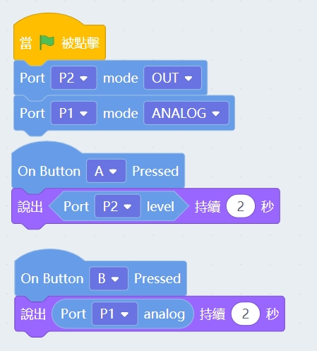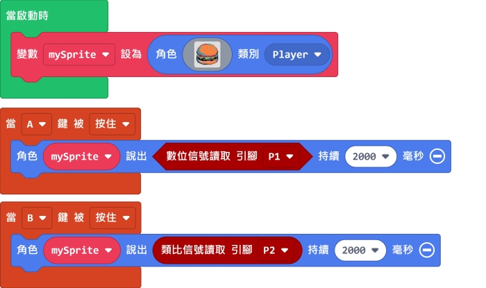 按A讀取P2的數位數值,按B讀取P1的類比數值。