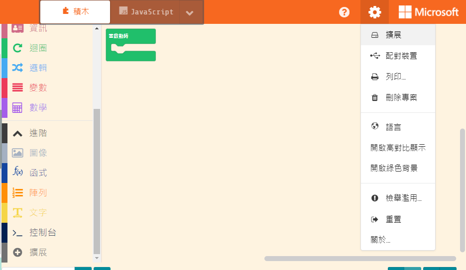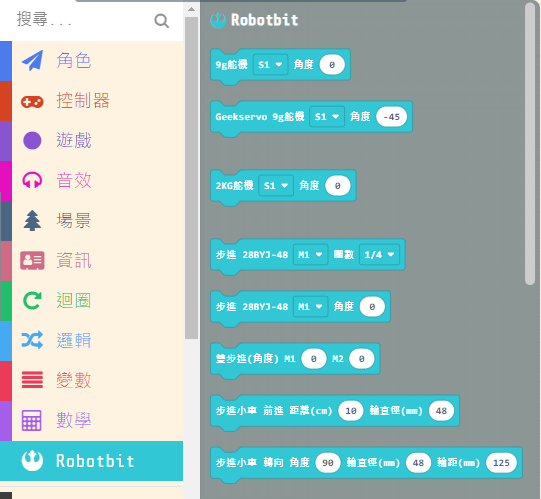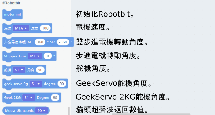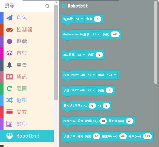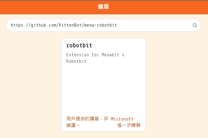 答:Robotbit的插件必須要在插上Robotbit時才能使用,只要將Meowbit插上Robotbit然後重啟就可以了。