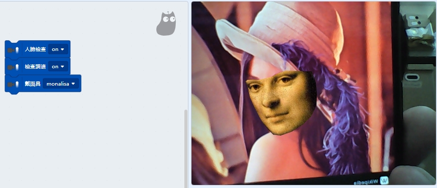 視訊偵測有人臉偵測的功能,我們試試將面具套上偵測到的人臉上。