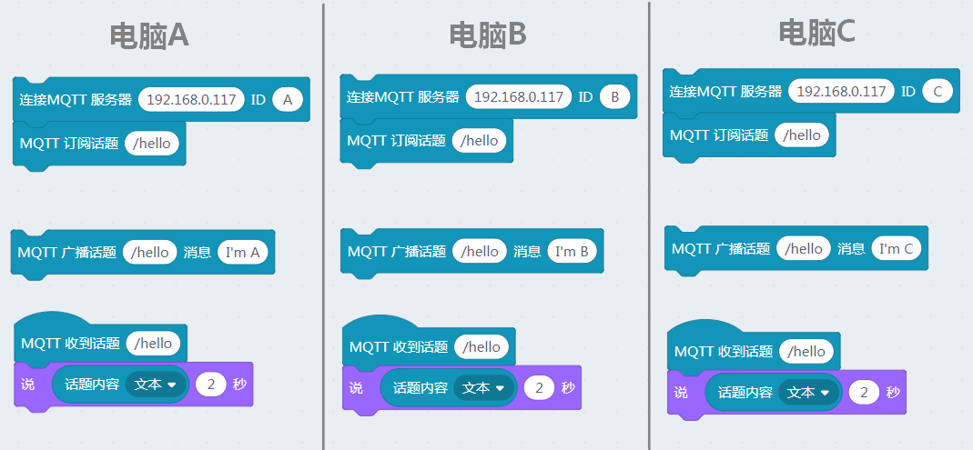 例如,在下圖,3台電腦都連接到192.168.0.117,大家都訂閱和發佈到同一個話題,就可以互相溝通。