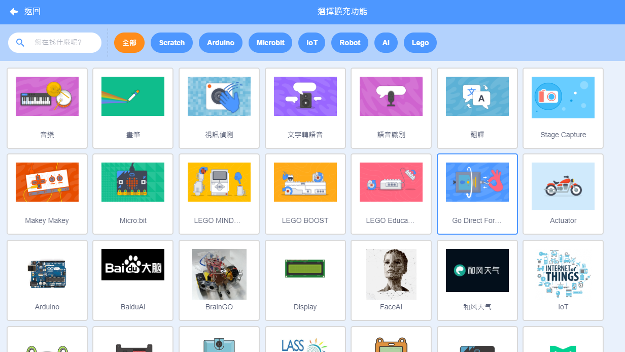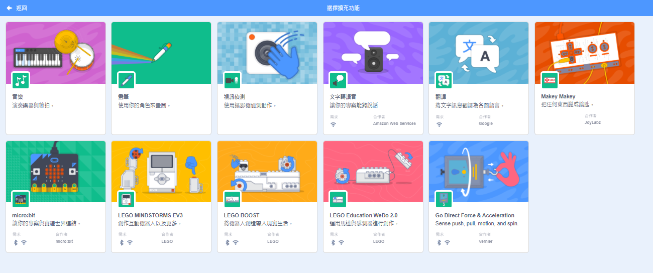 在Scratch之中,我們不可以增加自家插件,只能使用MIT提供的插件。