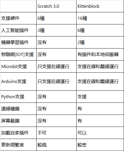 除了支持Kittenbot插件之外,Kittenblock對比起Scratch 3.0其實有什麼分別呢?