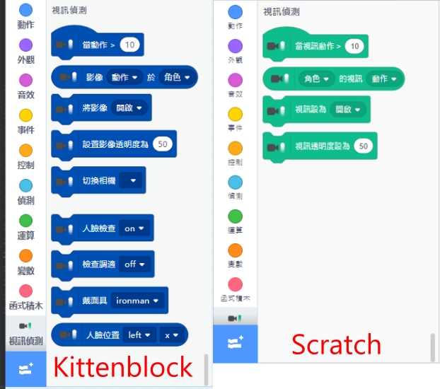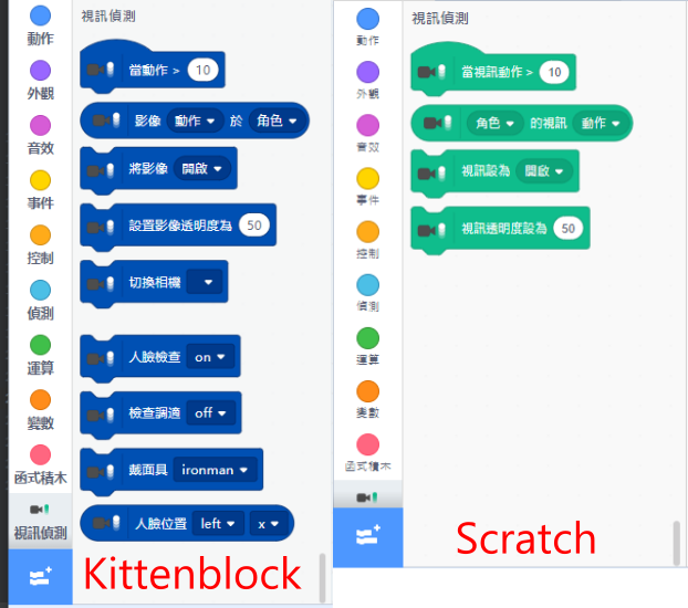 Kittenblock的插件比Scratch更多而且更加強大,Kittenblock預載了不同AI和機器學習的插件,實在與時並進。相比起來,Scratch的插件就顯得又貧乏又過時了。