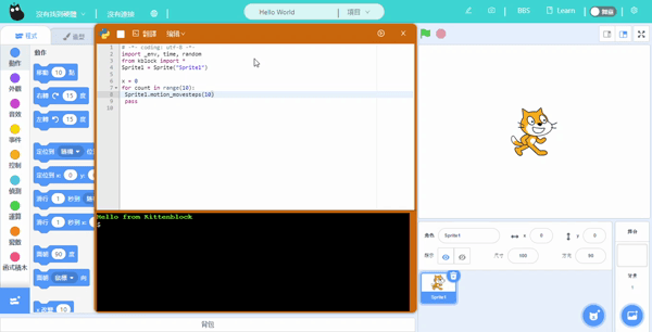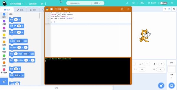 在Kittenblock中預載了Python 3語言的編輯器,而Kittenblock中的積木背後其實都是Python代碼。