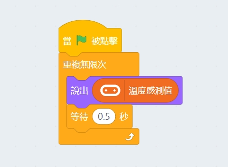 我們來試試編寫一個簡單的程式,讓小貓角色說出Microbit探測到的溫度。