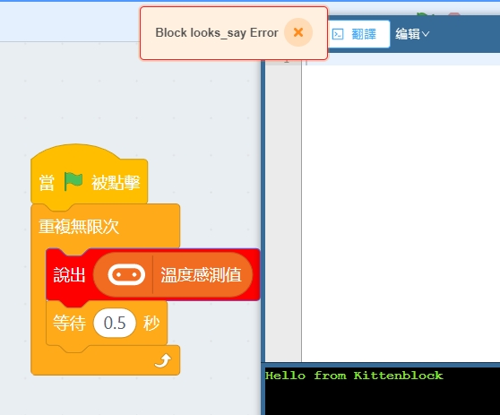 大家可以看見翻譯會失敗,並會有警告,將錯誤積木變成紅色。這是因為讓小貓說話的積木是舞台限定的,Microbit不能運行,所以翻譯失敗。