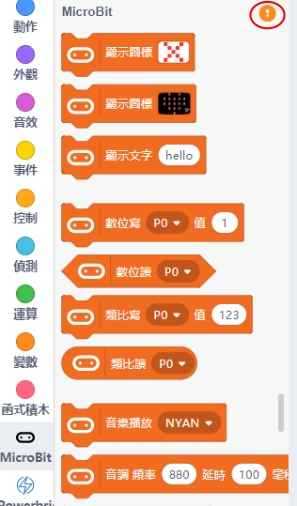 在Microbit的積木欄中按下感嘆號 ( ! ) 按鈕。