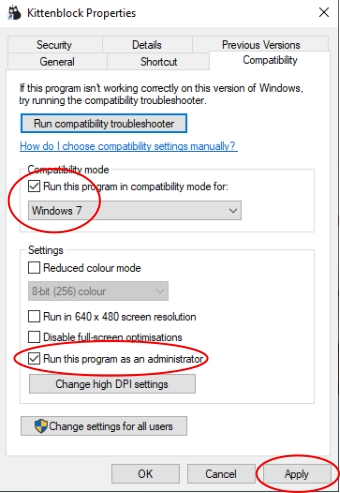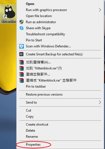 解決方法,右鍵Kittenblock圖示點擊屬性,更改兼容性和權限。