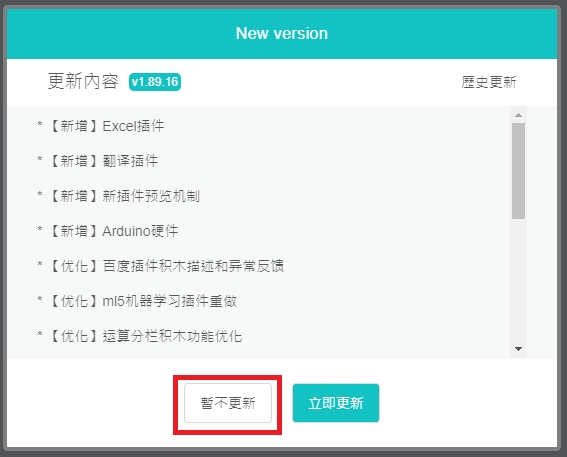 假如KittenBlock通知有更新可安裝的話,由於KittenBlock香港版與國內版有分別,請務必選擇暫不更新,以確保程式的穩定性。KittenBot HK會自行釋出KittenBlock的新版本。