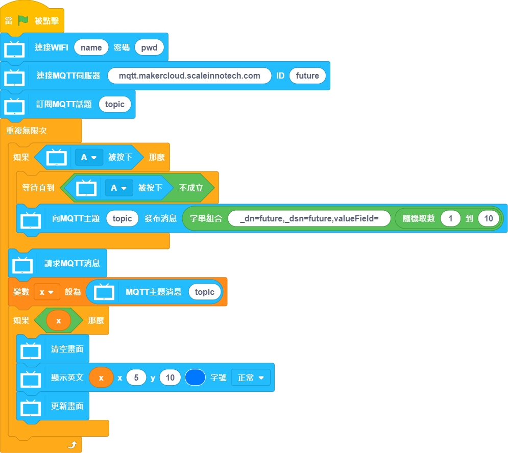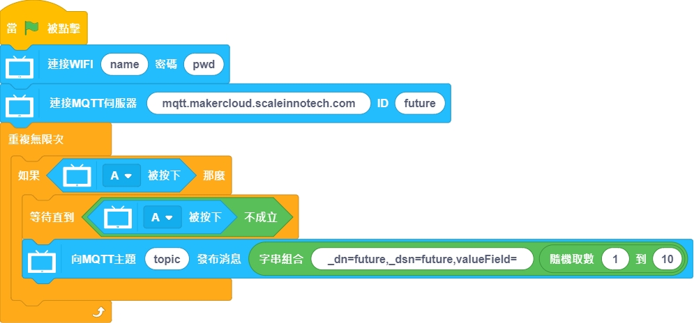 搭建出以下程式,按下A鍵將數據發送到MakerCloud。數據發布的格式請參考下圖。