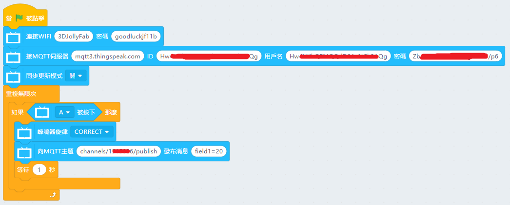 搭建出以下程式,按下A鍵發布信息20到ThingSpeak頻道。