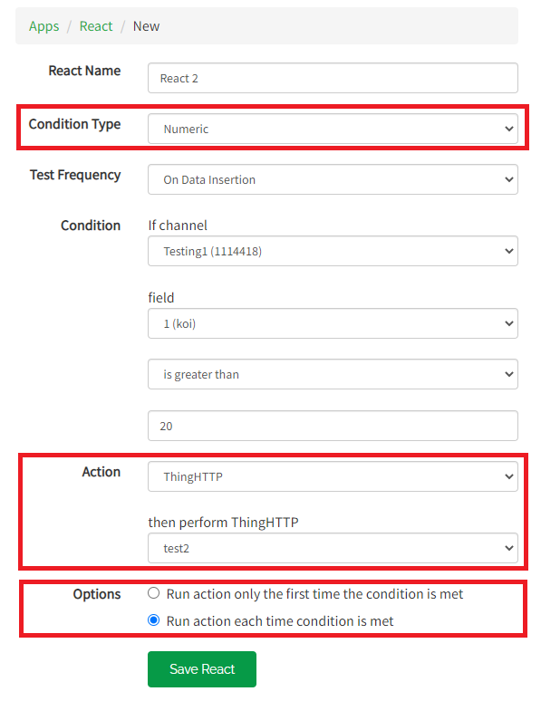 假如你的ThingSpeak頻道數據是數字格式,請選擇Numeric。在Action選擇ThingHTTP和你的React。然後剔選每次條件吻合都觸發的選項。