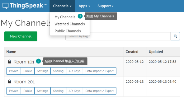 Channel 是平台為你而設獨有的雙向頻道; 你可以把數據上傳到你指定的Channel, 同時也可從Channel 中獲取數據。免費用戶最多只能設立4個頻道。